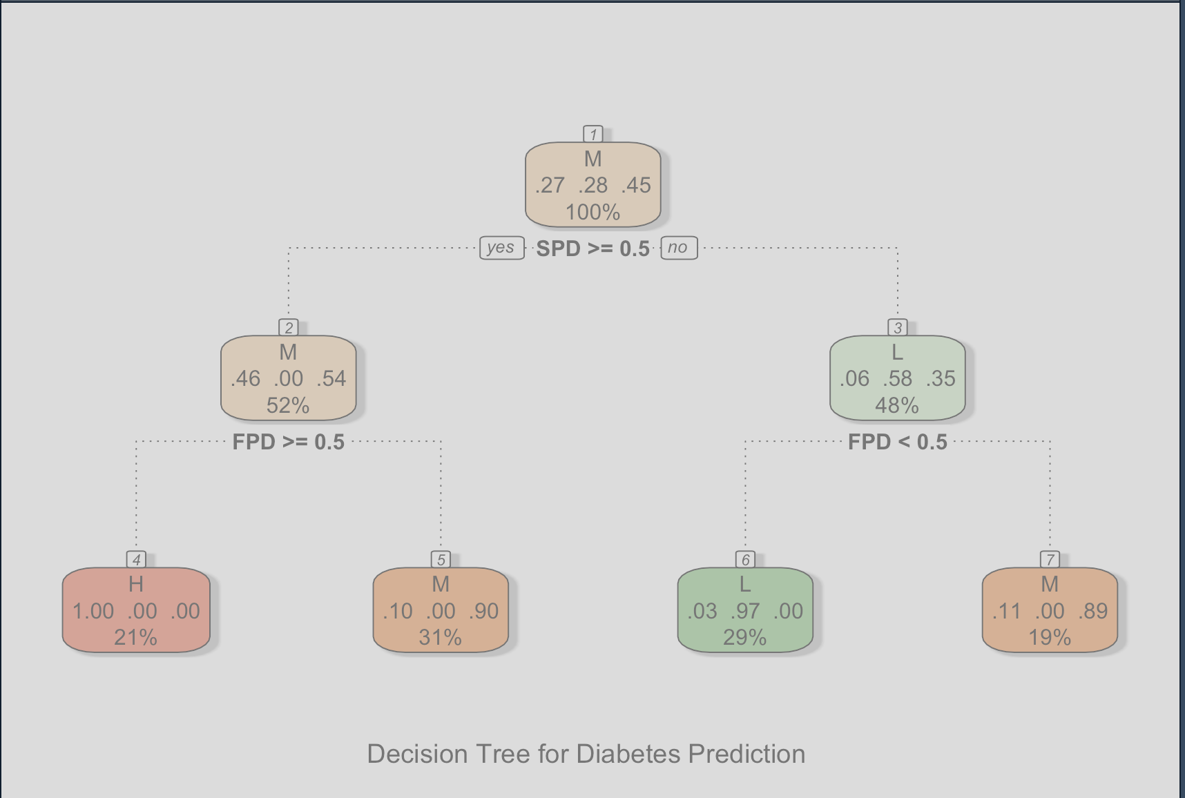 Building such a model is complex due to the number of factors (predictors) that affects the response, but the indented model should classify the risk of developing diabetes as Low (L), Medium (M), or High (H). The predictors are: Age (A), Weight (W), First Parent diabetic (FPD), Second Parent diabetic (SPD) (to keep things simple).